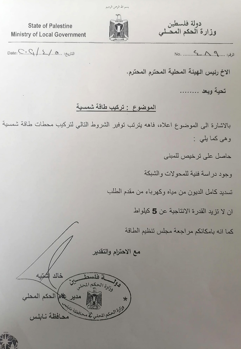 أعلن مجلس قروي عزموط، الاثنين 12.04.2021، عن شروط تركيب محطات طاقة شمسية لا تزيد قدرتها الإنتاجية عن 5 كيلو واط.
