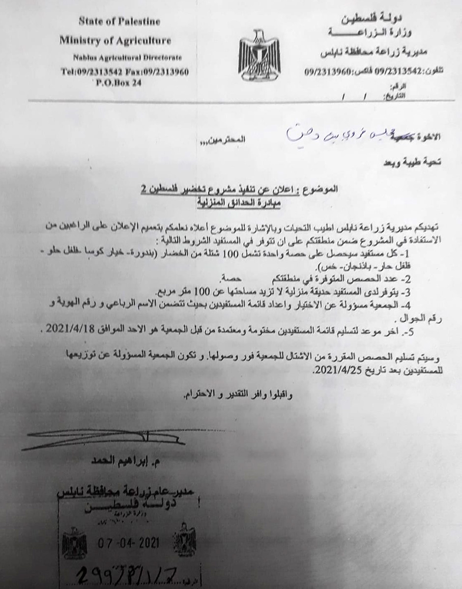مجلس قروي بيت دجن ينشر دعوة للمزارعين للاستفادة من مشروع الحديقة المنزلية، آخر موعد للتقديم الأحد 18.04.2021.