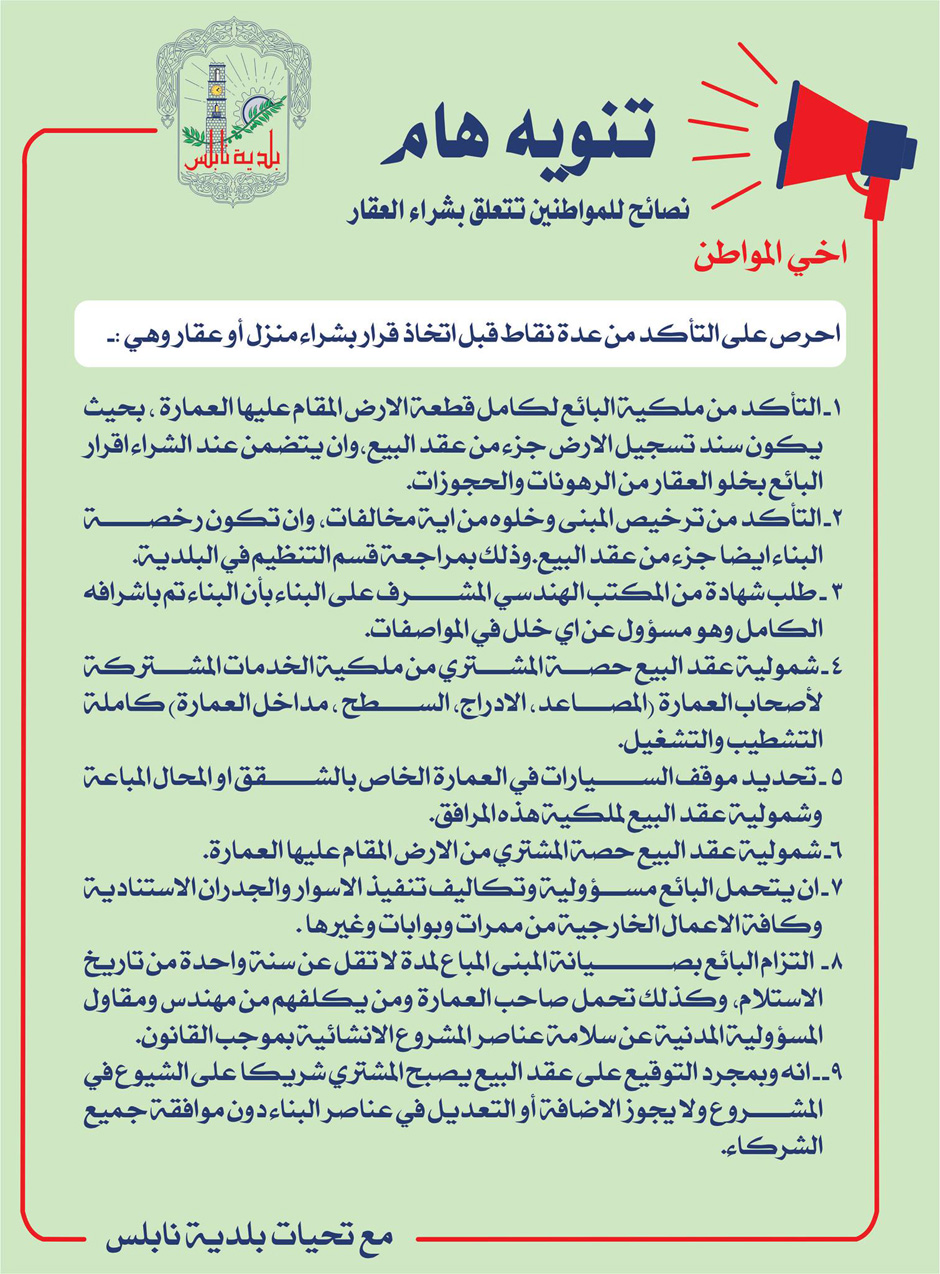 بلدية نابلس تنشر تنويها للمواطنين بضروة التأكد من عدة نقاط قبل شراء أو استئجار منزل أو عقار.