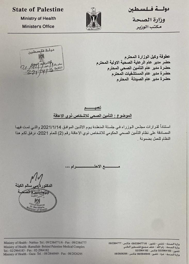 فاننا في الاتحاد الفلسطيني العام للاشخاص ذوي الاعاقة كجهة اختصاص تمثل الاشخاص ذوي الاعاقة الفلسطينيين وتتابع قضاياهم نعلمكم اننا قد تسلمنا اليوم التعميم الصادر من وزارة الصحة الخاص بتنفيذ بنود نظام التأمين الصحي رقم ٢٠٢١/٢