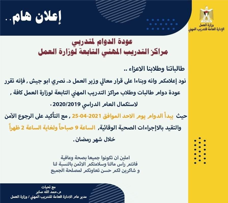أعلنت الإدارة العامة للتدريب المهني، الخميس 22.04.2021، عن عودة الدوام في مراكز التدريب المهني التابعة لوزارة العمل، لاسكتمال العام الدراسي.