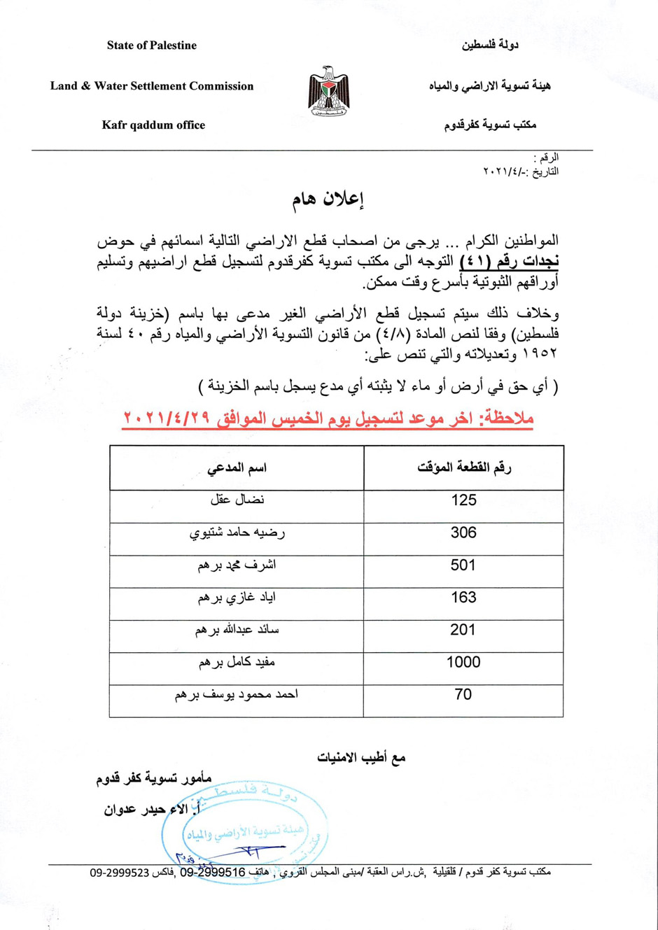 نشرت دائرة تسوية أراضي محافظة قلقيلية، الأحد 25.04.2021، إعلانا خاصا بأعمال التسوية في بلدة كفر قدوم.
