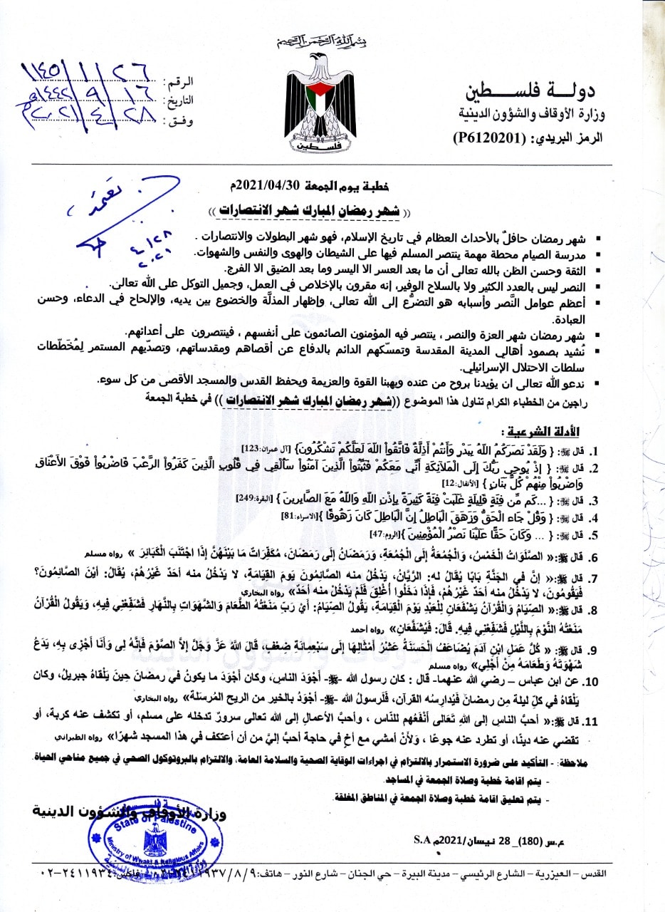 وزارة الأوقاف تحدد لأئمة السماجد موضوع خطبة صلاة الجمعة 30.04.2021.