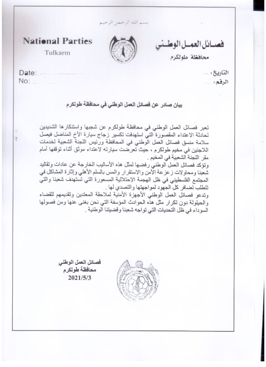 نشرت فصائل العمل الوطني في محافظة طولكرم، الاثنين 03.05.2021، بيان استنكار للاعتداء الذي تعرض له منسق فصائل العمل الوطني في محافظة طولكرم.