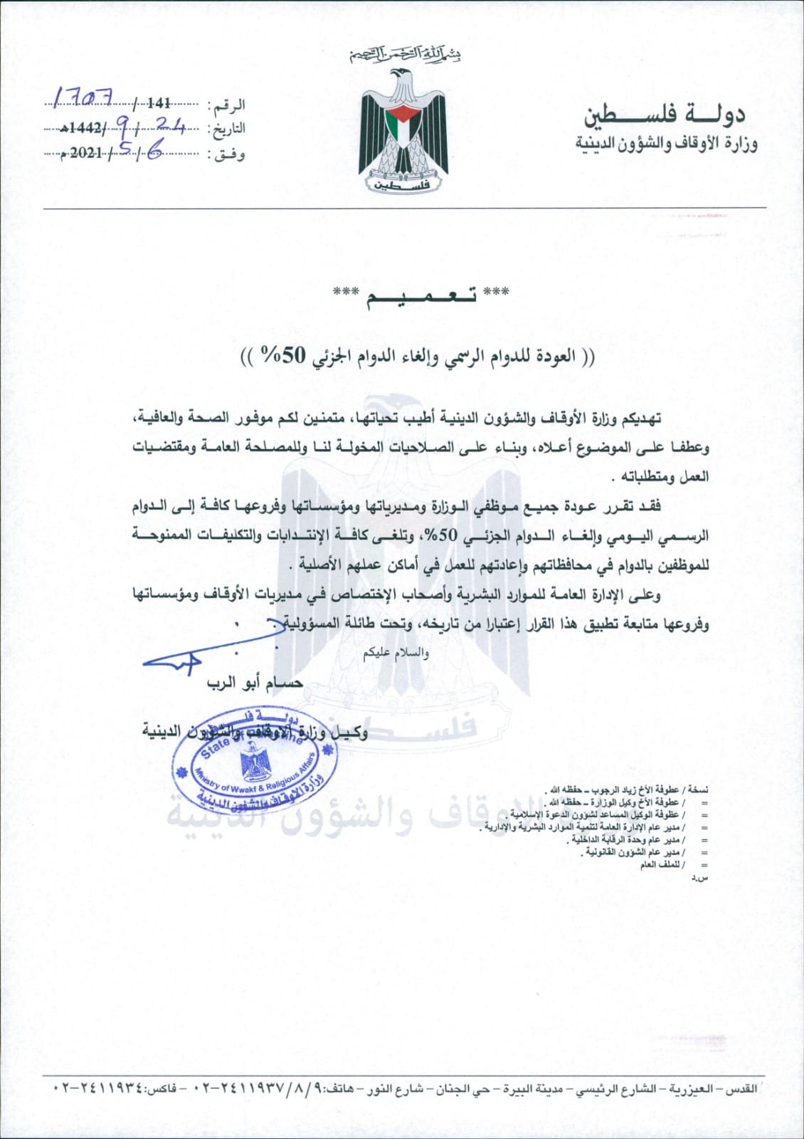 وزارة الأوقاف والشؤون الدينية تصدر تعميماً بخصوص دوام موظفي الوزارة ومديرياتها ومؤسساتها وفروعها في كافة المحافظات.