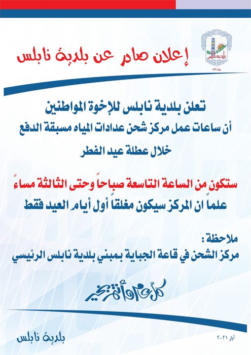 أعلنت بلدية نابلس، الإثنين 10.05.2021، عن موعد شحن عدادات المياه مسبقة الشحن خلال عطلة عيد الفطر السعيد.