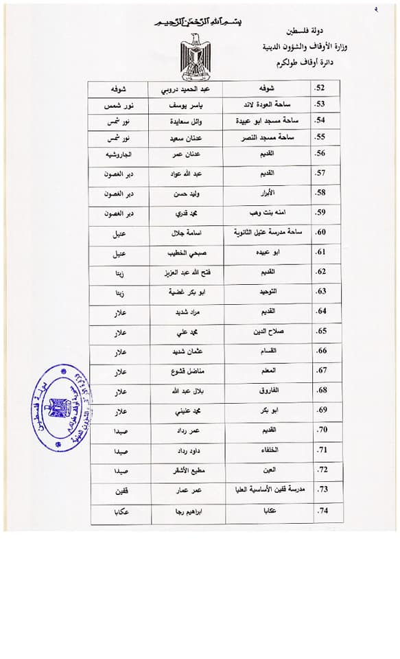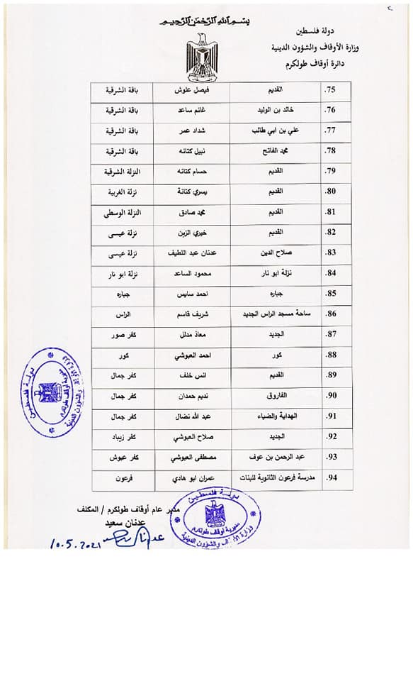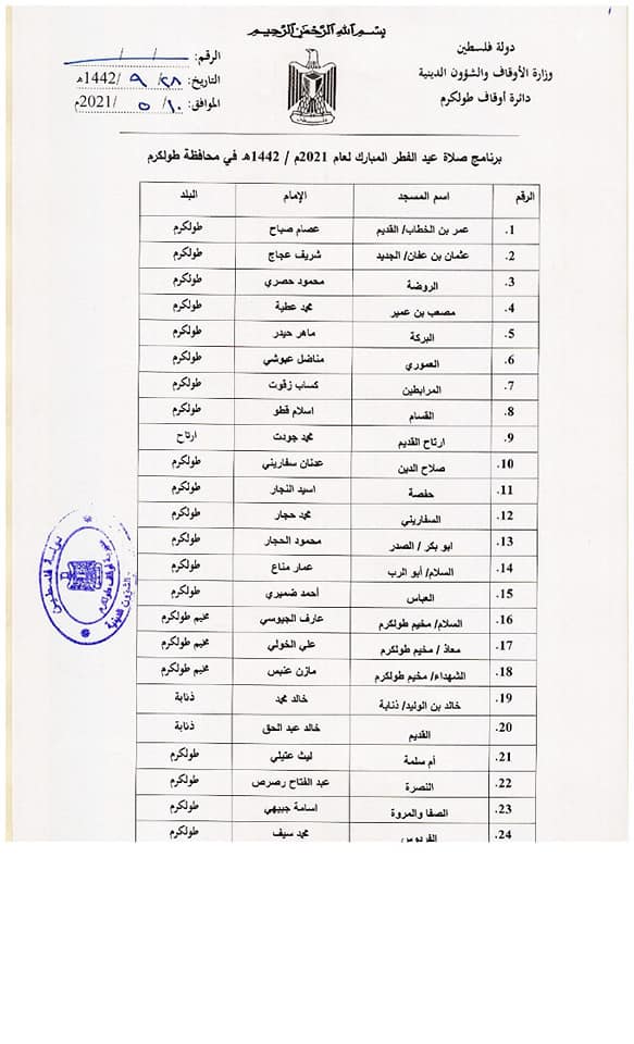 مديرية أوقاف طولكرم تنشر أماكن صلاة العيد، الخميس 13.05.2021.