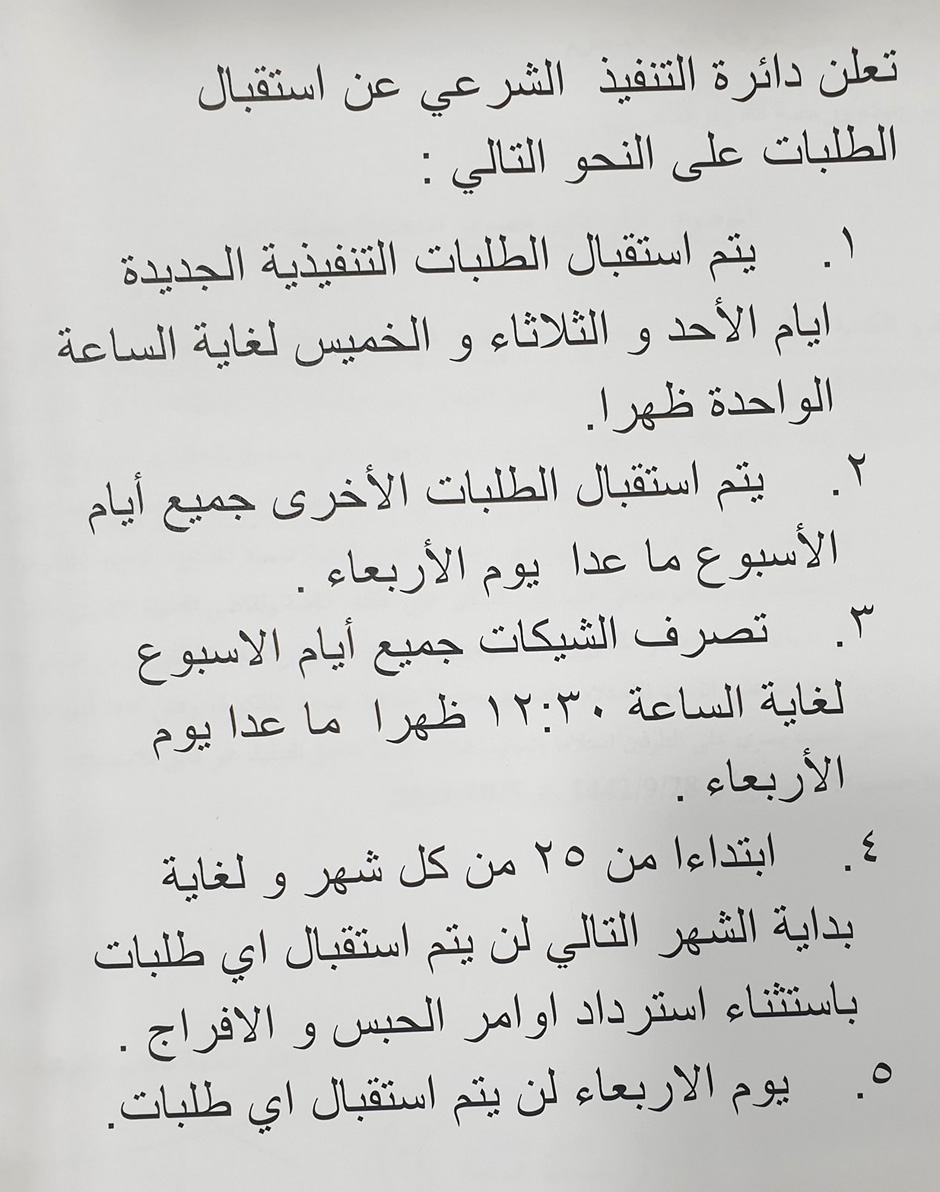 أعلنت دائرة التنفيذ الشرعي في محكمة نابلس الشرعية، الأحد 16.05.2021، عن مواعيد استلام الطلبات في المحكمة.