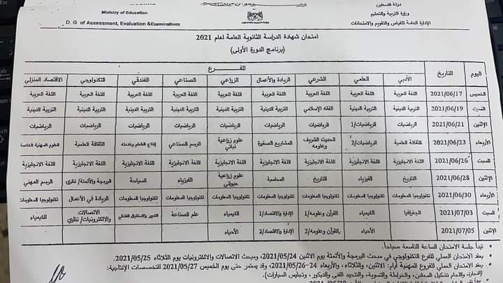 وزارة التربية والتعليم تنشر برنامج الدورة الأولى لامتحان شهادة الثانوية العامة لعام 2021.