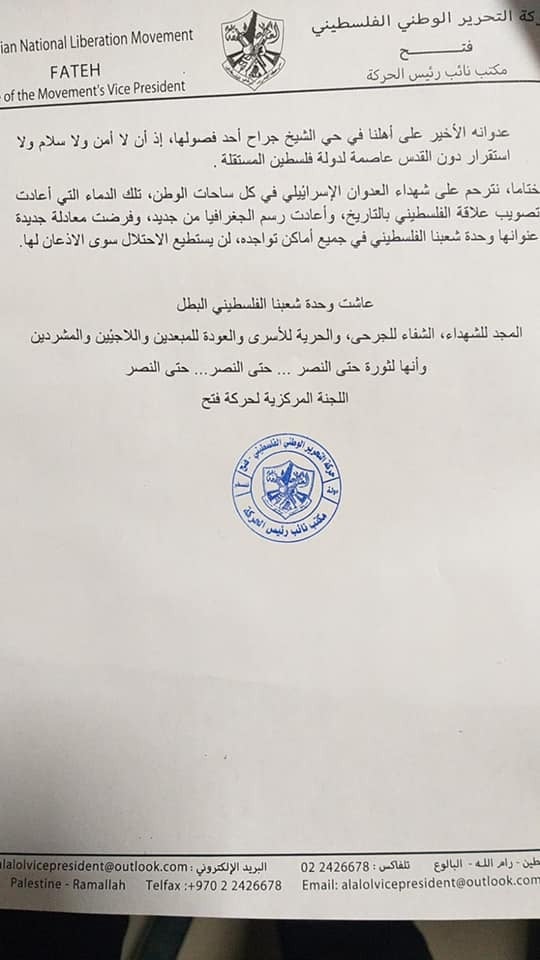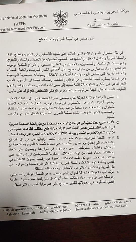 مركزية فتح تدعو إلى إعلان يوم الثلاثاء يوم غضب شعبي شامل، على مختلف الساحات وفي كل نقاط الاحتكاك.