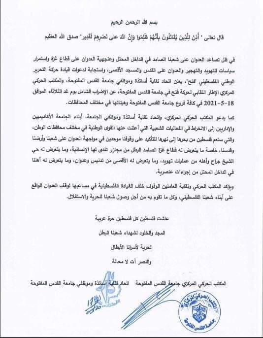 المصدر: المكتب الحركي المركزي جامعة القدس المفتوحة - اتحاد نقابة أساتذة وموظفي جامعة القدس المفتوحة