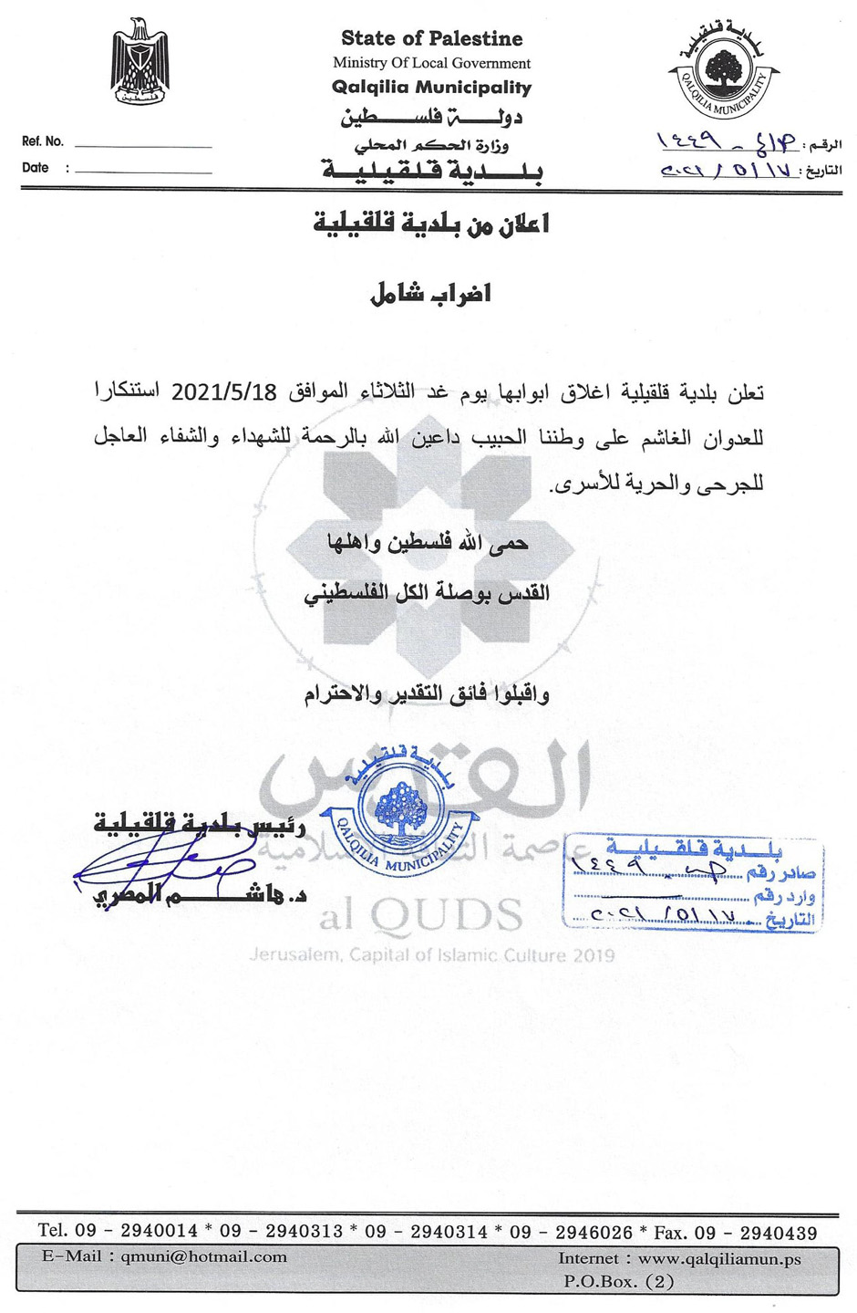 أعلنت بلدية قلقيلية، الاثنين 17.05.2021، عن الالتزام بالإضراب الثلاثاء، وإغلاق أبوابها.