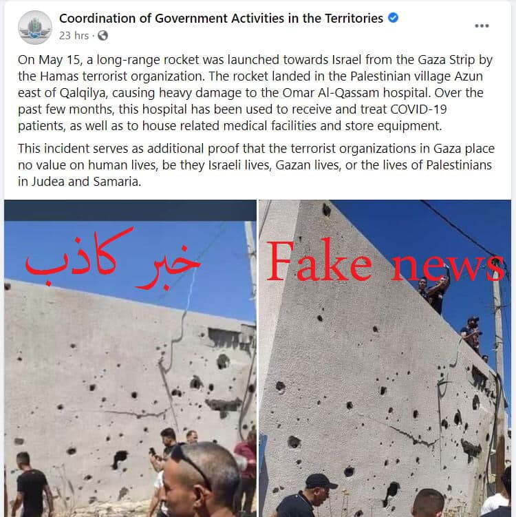 وقالت الوزارة في بيان صحفي، مساء الاثنين 17.05.2021، إن الاحتلال الإسرائيلي سعى لتضليل الرأي العام العالمي من خلال نشر أخبار كاذبة باللغة الإنجليزية مرفقة بصور ليست لمستشفى عزون، حيث روجت صفحة "المنسق" الموثقة على فيسبوك وحسابه على تويتر لهذا الخبر.