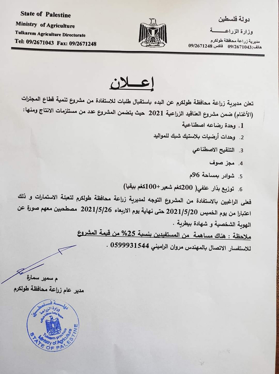أعلنت مديرية زراعة محافظة طولكرم، الأربعاء 19.05.2021، عن البدء باستقبال طلبات للاستفادة من مشروع تنمية قطاع المجترات.