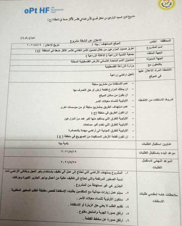 أعلنت بلدية بيتا، الأربعاء 19.05.2021، عن مشروع تأهيل أراضٍ زراعية في المناطق (ج)، ضمن المعايير الواردة أدناه.