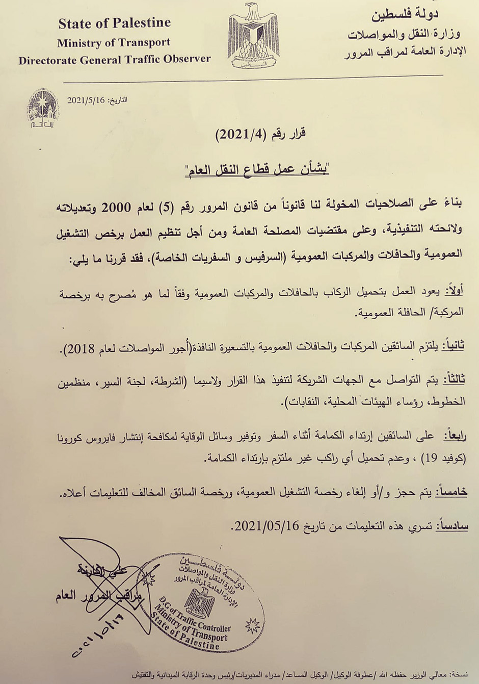 وزارة النقل والمواصلات تعلن عن عودة العمل بتحميل الركاب بالمواصلات العامة كما كان الوضع قبل تعليمات فيروس كورونا، وتلزم السائقين بتسعيرة أجور المواصلات لعام 2018.