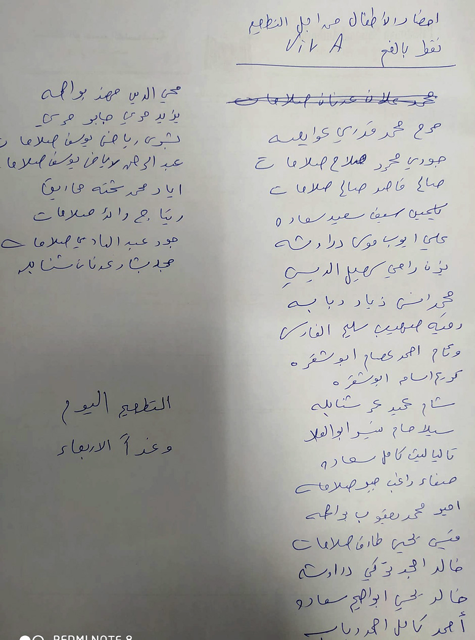 "نرجو من جميع أولياء أمور الاطفال المذكورين أدناه مراجعة العيادة الصحية الثلاثاء، وغدا الأربعاء 26/5/2021 من أجل تطعيم الأطفال مع إحضار كرت التطعيم".