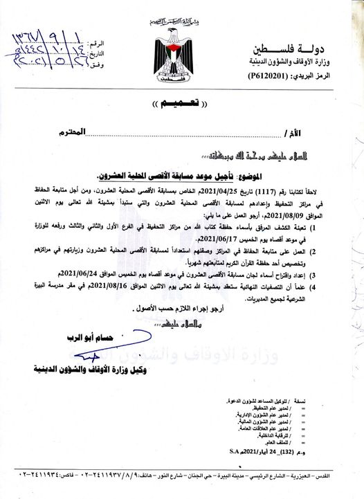 وزارة الأوقاف والشؤون الدينية تعلن عن تأجيل موعد مسابقة الأقصى المحلية العشرون.
