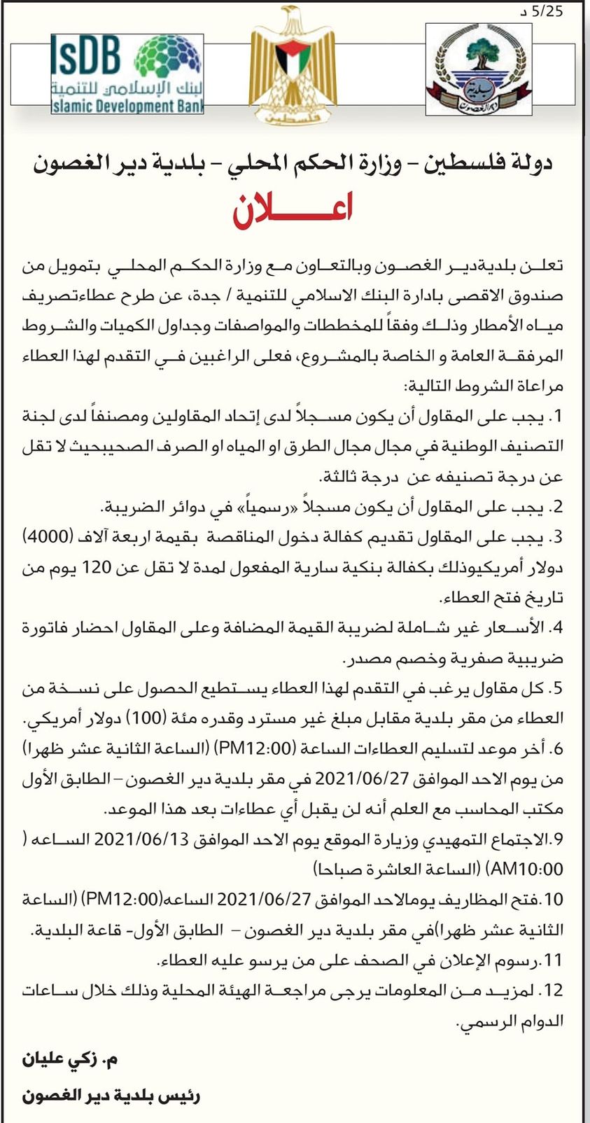 بلدية دير الغصون تعلن عن طرح عطاء تصريف مياه الأمطار ضمن شروط. آخر موعد للتقديم الأحد 27.6.2021.