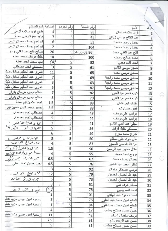 ".. المواطنين الواردة أسماؤهم في الكشف أدناه يرجى الحضور الى قاعة مكتبه البلدية الثلاثاء الساعة التاسعة والنصف صباحا وذلك من أجل التواصل مع المحامي الموكل للدفاع عن أراضي جبل صبيح "المحوطة" التي شرع الاحتلال في إقامة مستعمرة عليها.