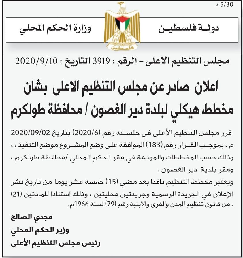 دير الغصون- إعلان تنفيذ مخطط هيكلي