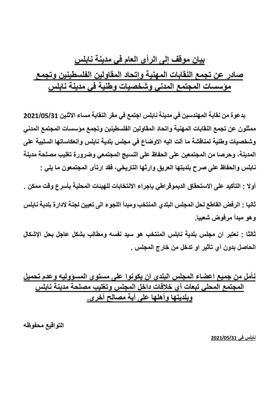بيان النقابات المهنية وتجمع مؤسسات المجتمع المدني واتحاد المقاولين والشخصيات الوطنية حول أوضاع بلدية نابلس.
