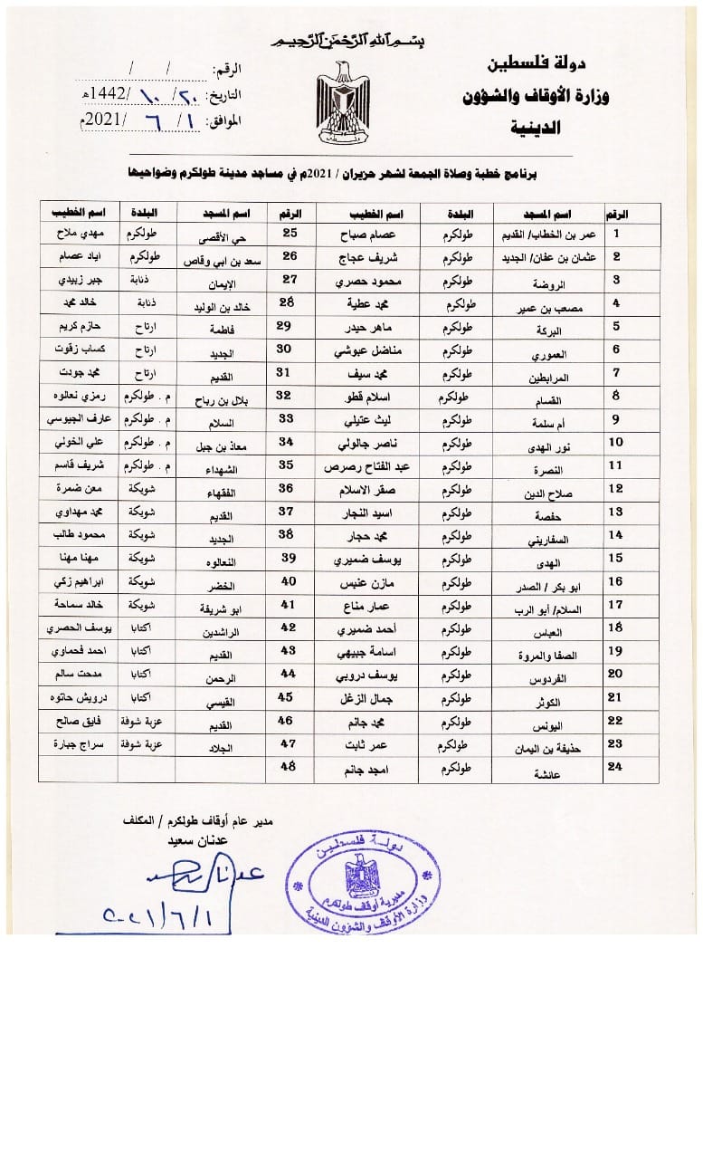 مديرية الأوقاف في طولكرم تنشر برنامج الخطباء لشهر حزيران 2021، لمدينة طولكرم و ضواحيها.