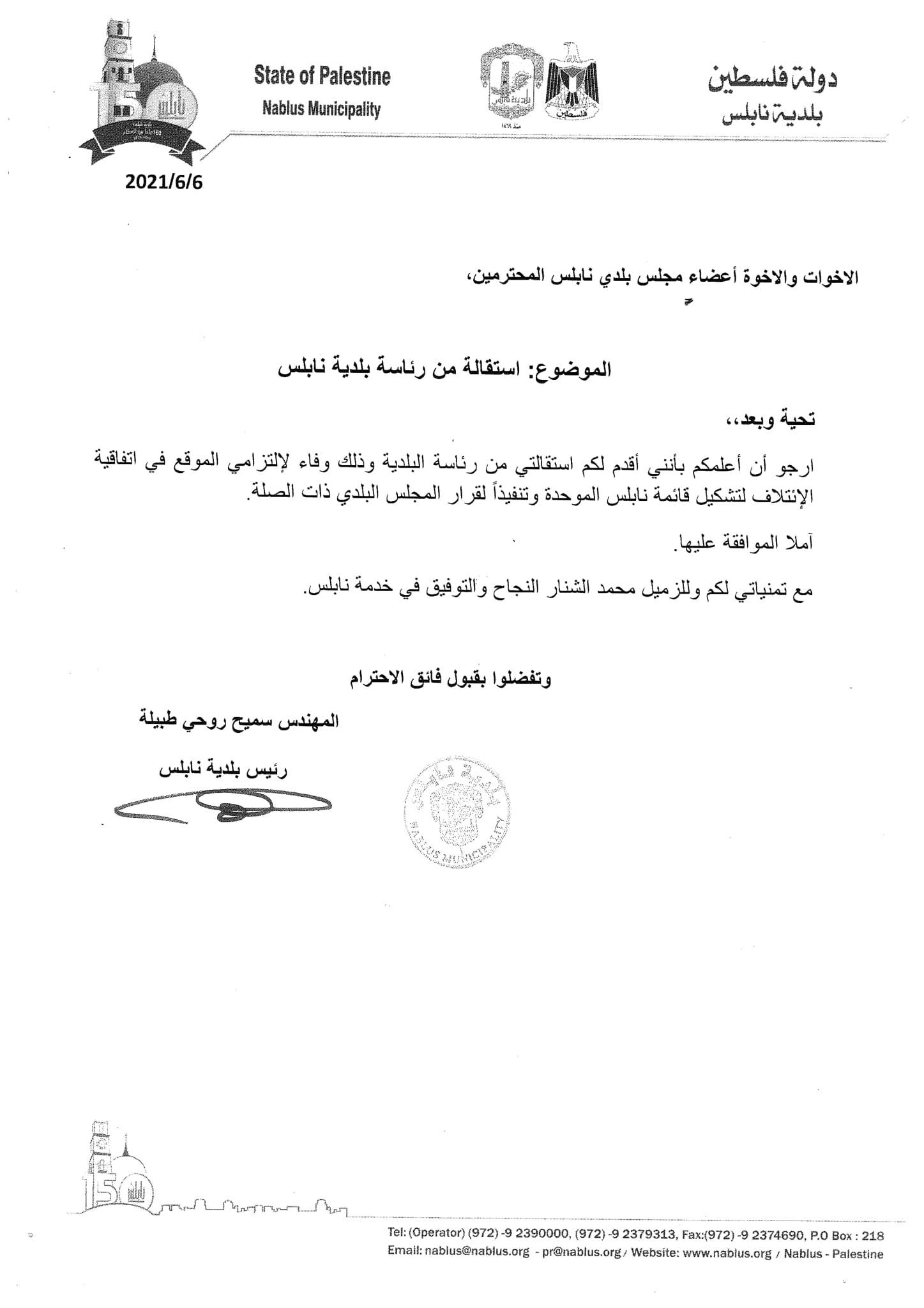 الإعلان عن استقالة رئيس بلدية نابلس سميح طبيلة.
