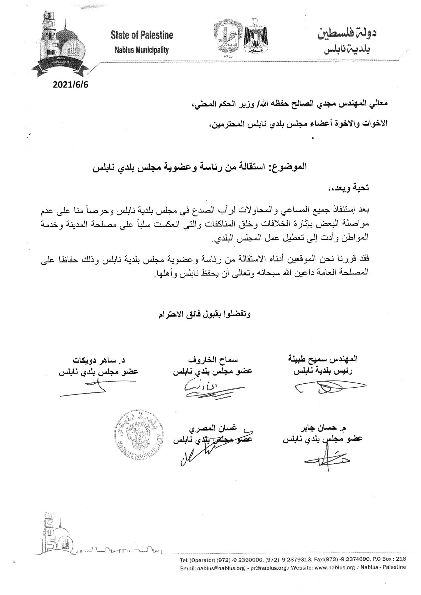 4 أعضاء يقدمون استقالتهم من مجلس بلدي نابلس، بالإضافة لرئيس البلدية سميح طبيلة.