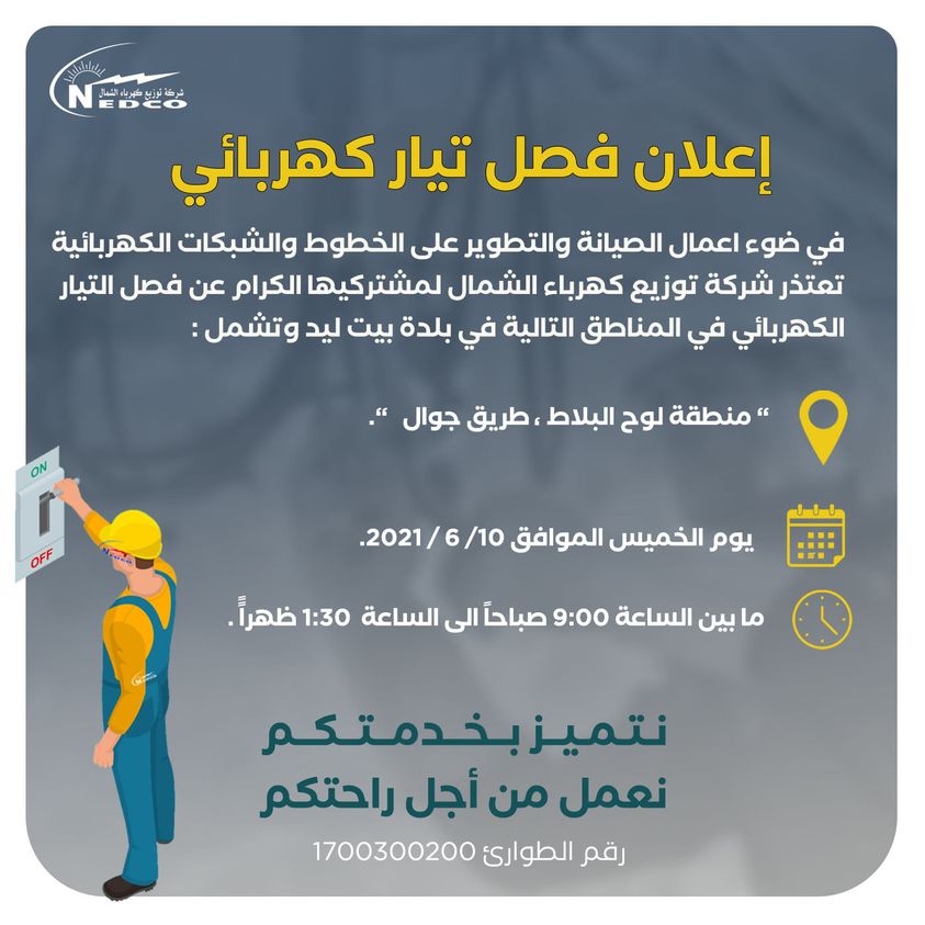 شركة توزيع كهرباء الشمال تعلن عن فصل التيار الكهربائي في بيت ليد لأغراض الصيانة.