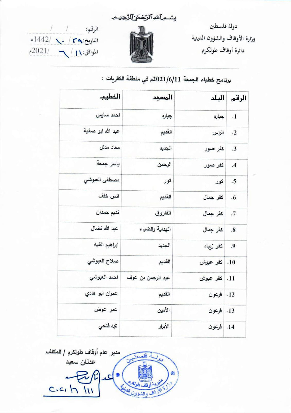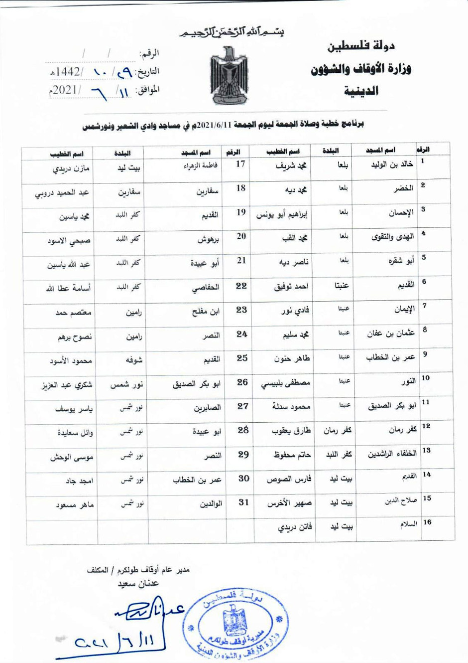 مديرية الأوقاف في طولكرم تنشر برنامج خطباء الجمعة 11.06.2021، منطقة الكفريات، وواد الشعير ومخيم نور شمس.