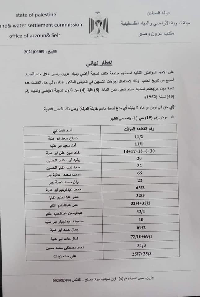 نشرت بلدية قلقيلية، الاثنين 14.06.2021، أسماء المواطنين الذين يجب عليهم مراجعة مكتب تسوية عزون وصير، خلال مدة أقصاها أسبوع.