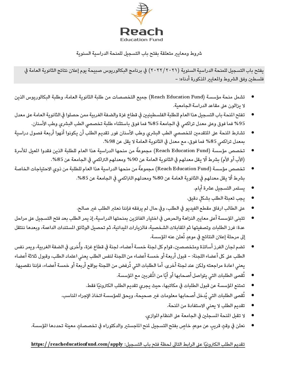 إليكم الشروط والمعايير المتعلقة بفتح باب التسجيل في المنحة الدراسية السنوية لمؤسسة (Reach Education Fund) للعام (2021/2022) في برنامج البكالوريوس.