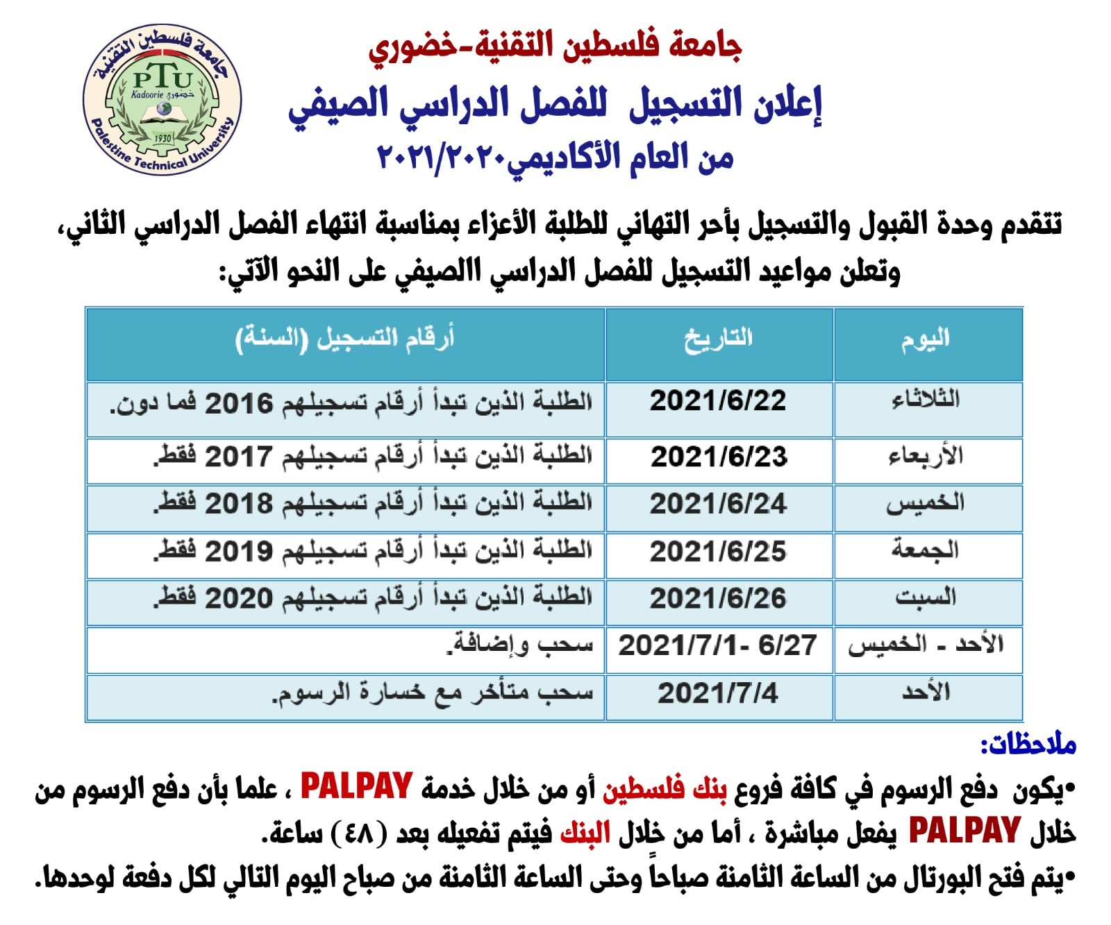 إعلان بخصوص التسجيل للفصل الصيفي في جامعة خضوري بطولكرم.