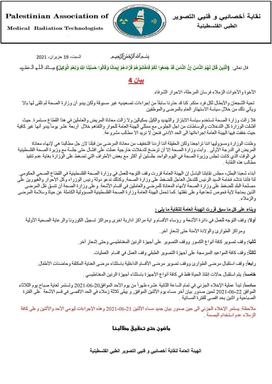 نقابة أخصائيي وفنيي التصوير الطبي الفلسطينية تصعد من إجراءاتها وتعلن وقف العمل.