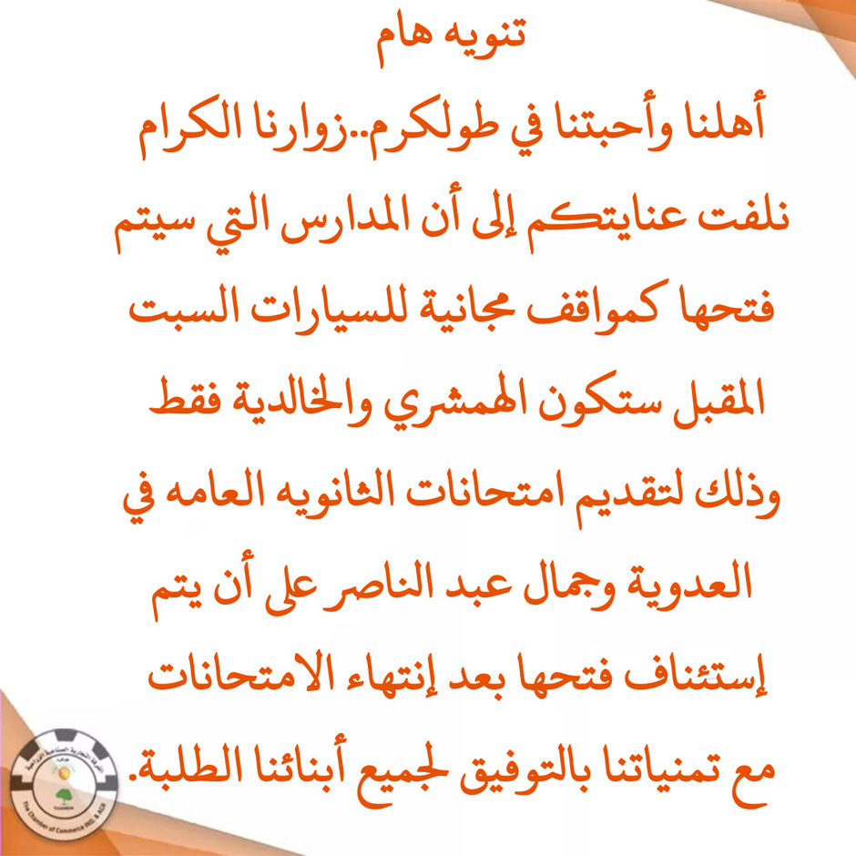 أعلنت غرفة تجارة وصناعة طولكرم، الخميس 24.06.2021، عن تخصيص مدرسة الهمشري ومدرسة الخالدية كمواقف مجانية للسيارات السبت.