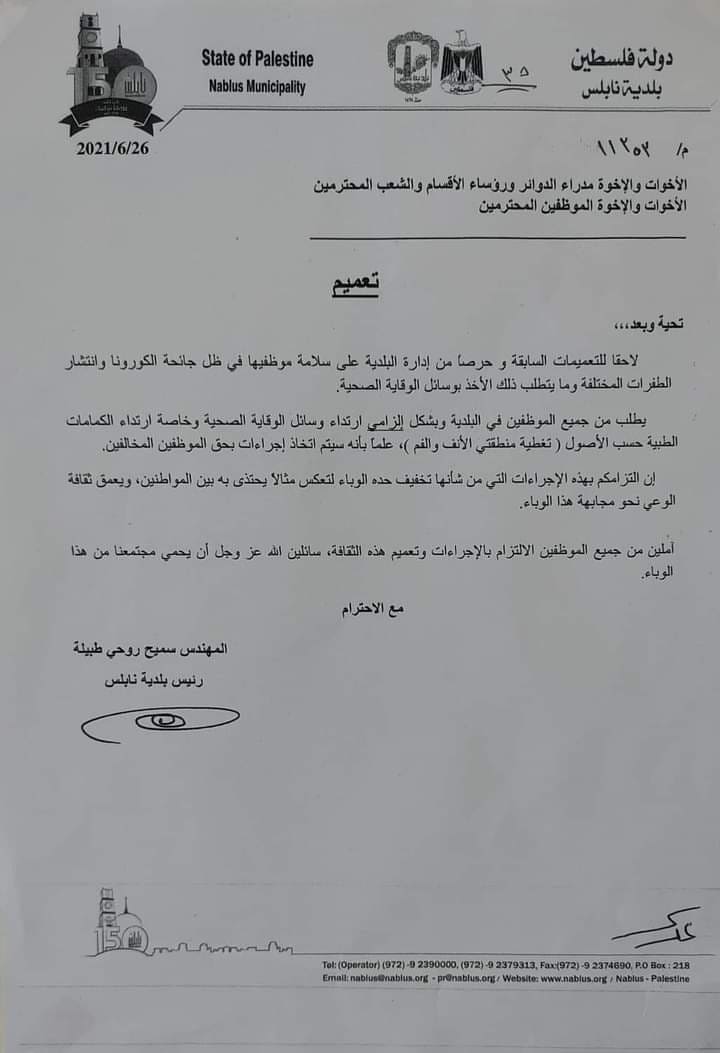 في ظل انتشار الطفرات المختلفة لكورونا، بلدية نابلس تعمم على موظفيها إلزامية الالتزام بوسائل الوقاية وإلا سيتم اتخاذ إجراءات بحق المخالفين.