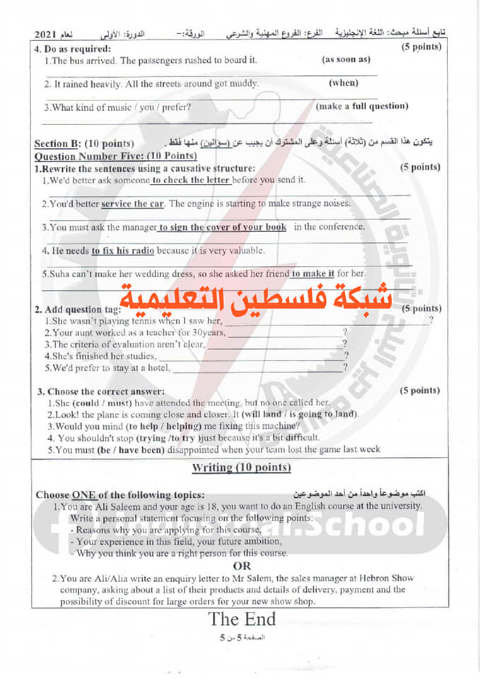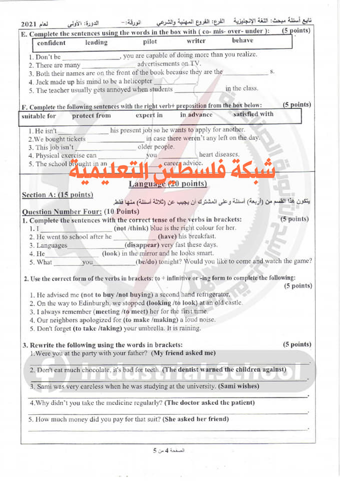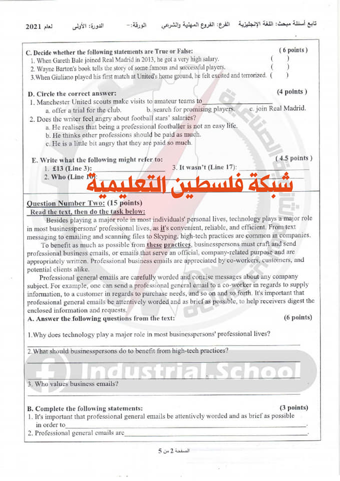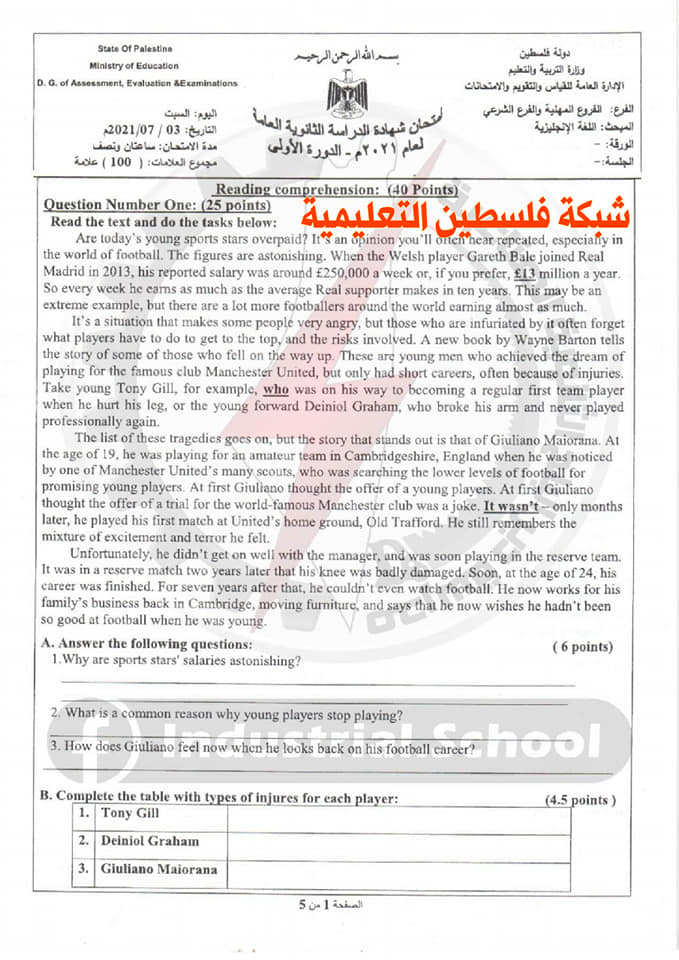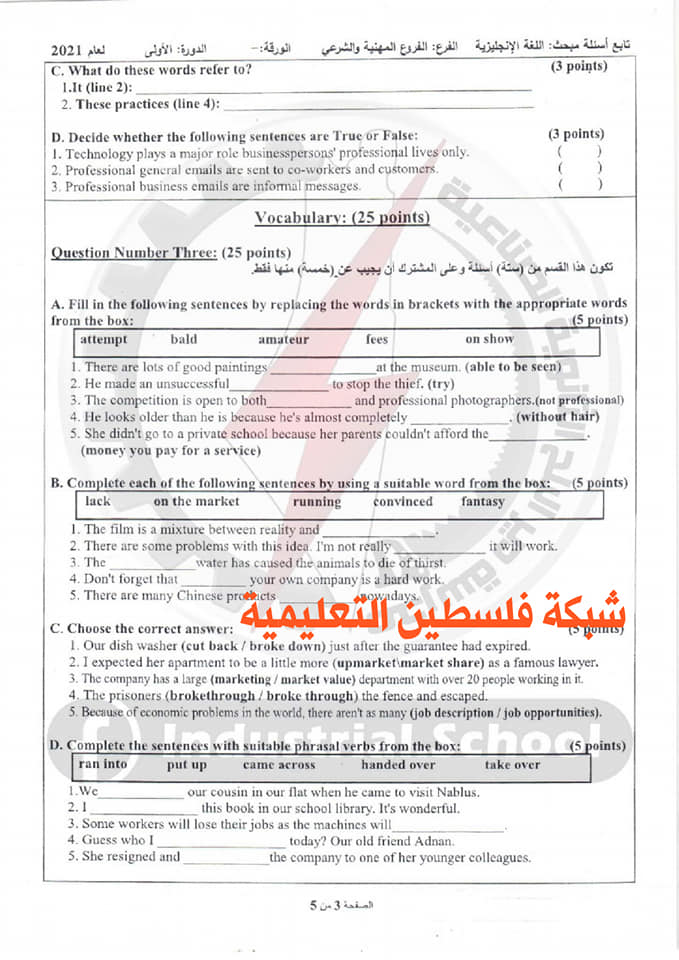 أسئلة امتحان الثانوية العامة لمبحث اللغة الانجليزية الفرع المهنية والشرعي، السبت 03.07.2021.