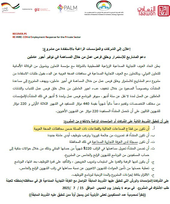 أعلنت غرفة تجارة وصناعة نابلس، الثلاثاء 06.07.2021، عن مشروع دعم المشاريع للاستمرار وخلق فرص عمل من خلال توفير أجور عاملين.