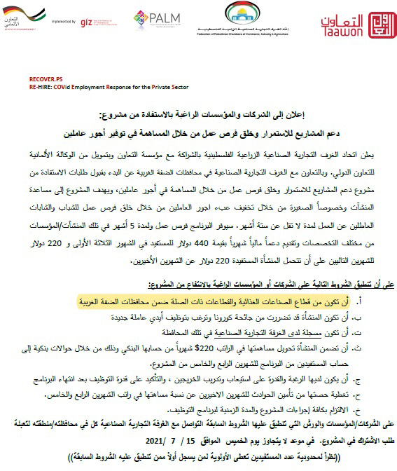 نشرت غرفة تجارة وصناعة نابلس، الثلاثاء 13.07.2021، إعلانا للشركات والمصانع الغذائية الراغبة بالاستفادة من مشروع دعم المشاريع للاستمرار وخلق فرص عمل من خلال المساهمة في توفير أجور عاملين.
