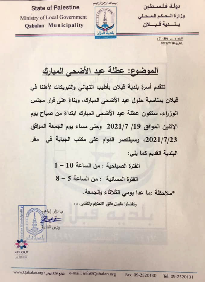 نشرت بلدية قبلان، الأحد 18.07.2021، أوقات دوام مكتب الجباية في بلدية قبلان خلال فترة عطلة عيد الأضحى.