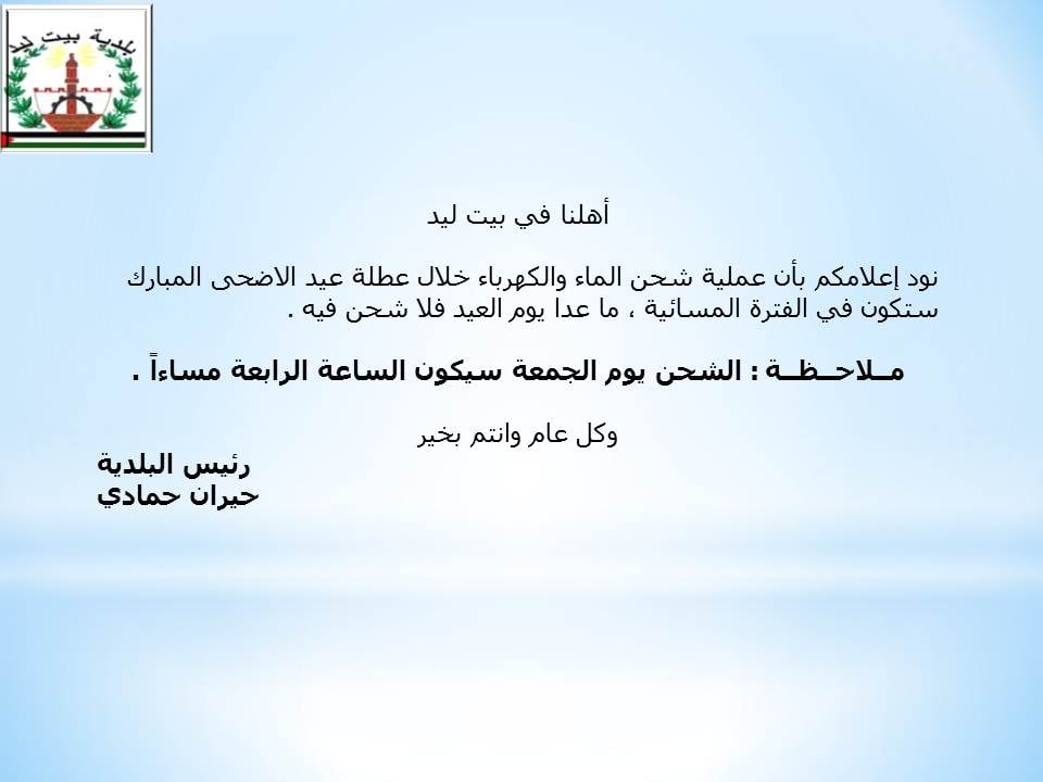 بلدية بيت ليد تنشر أوقات شحن الكهرباء والمياه خلال عطلة العيد ما عدا الثلاثاء.
