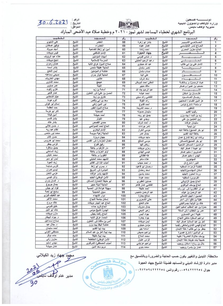 أسماء خطباء صلاة الجمعة في مساجد مدينة نابلس وضواحيها لشهر تموز.