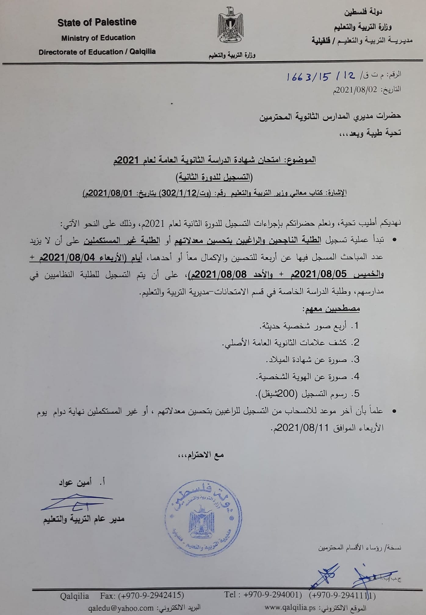 الإعلان عن التسجيل للدورة الثانية لطلبة الثانوية العامة في مدارس قلقيلية.