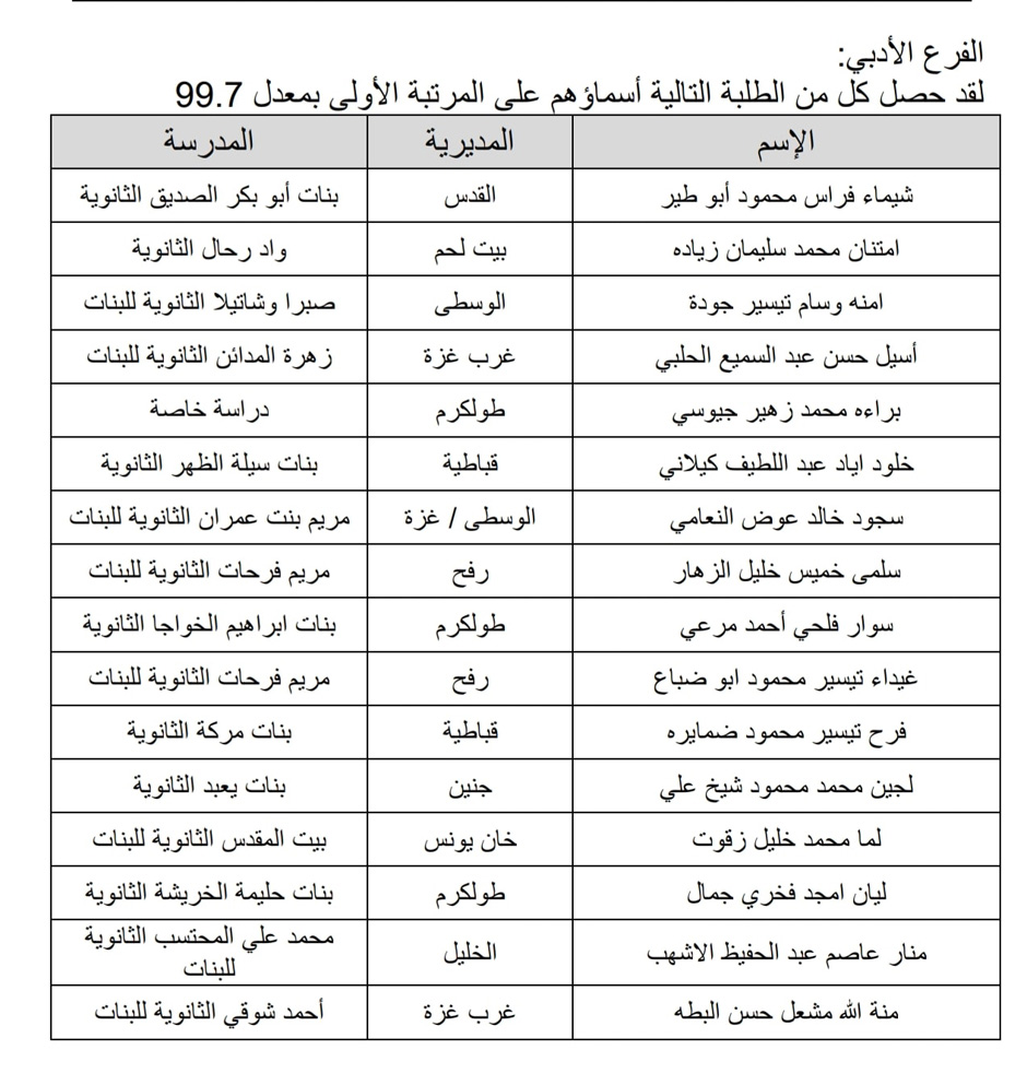 قائمة بأسماء العشرة الأوائل على مستوى فلسطين في امتحان الثانوية العامة الفرع الأدبي، الثلاثاء 03.08.2021.