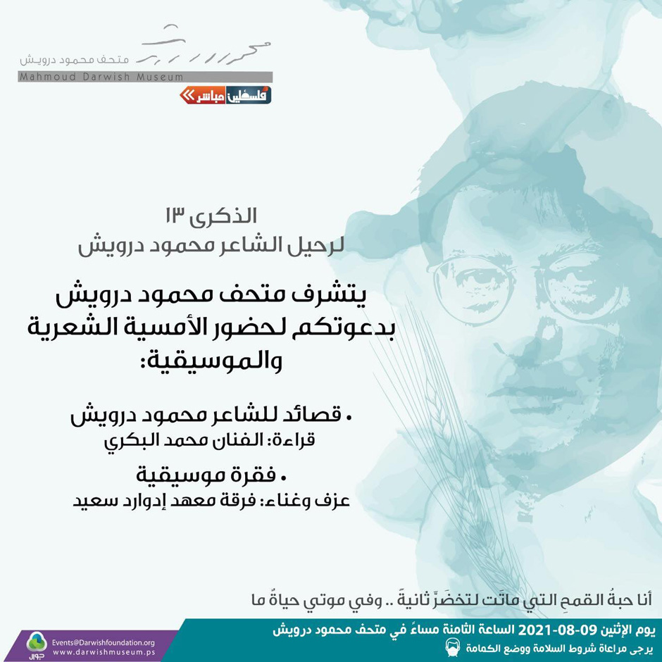 يتـشــرف مـتحـف مـحـمــود درويــش بدعـــوتـكـم لحضـور الأمسـية الشعريـة والموسيـقيـة