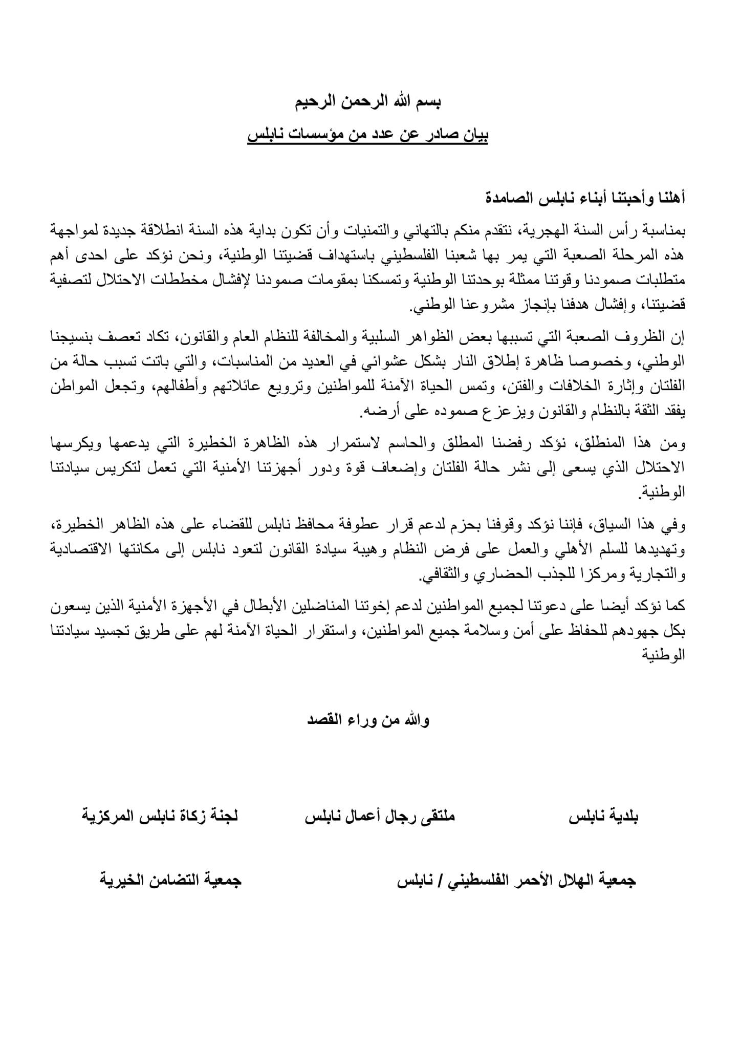 بيان صادر عن عدد من مؤسسات نابلس