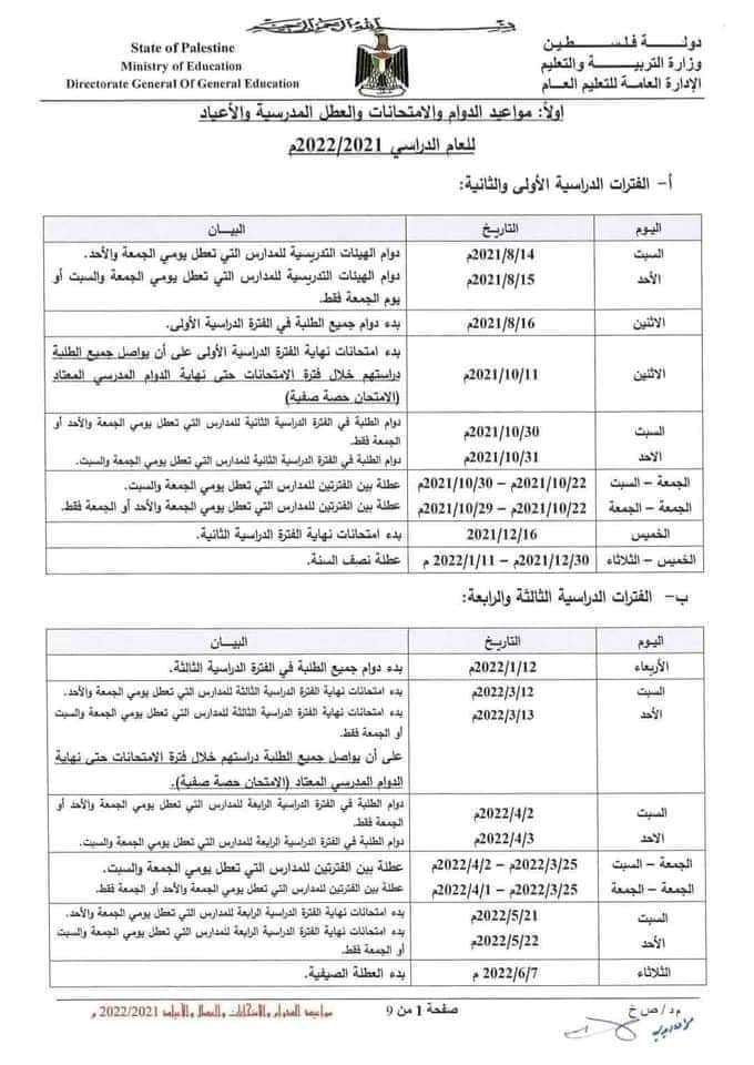 وزارة التربية والتعليم تنشر مواعيد الدوام والامتحانات والعطل المدرسية والأعياد للعام الدراسي 2021-2022.