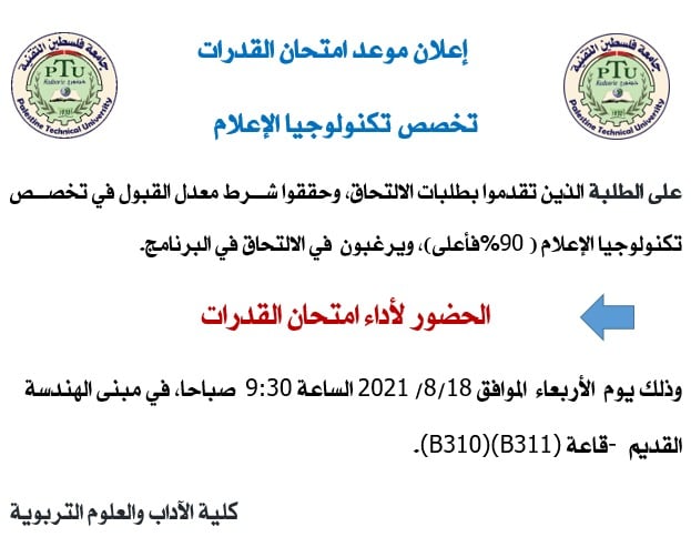 جامعة فلسطين التقنية- خضوري تعلن عن موعد امتحان القدرات للطلبة الجدد تخصص تكنولوجيا الإعلام.