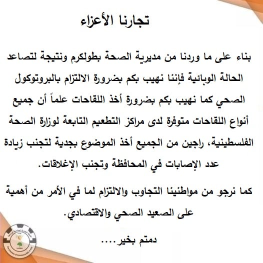 الغرفة التجارية في طولكرم تعلن عن ضرورة تطعيم التجار في ظل تصاعد الحالة الوبائية.